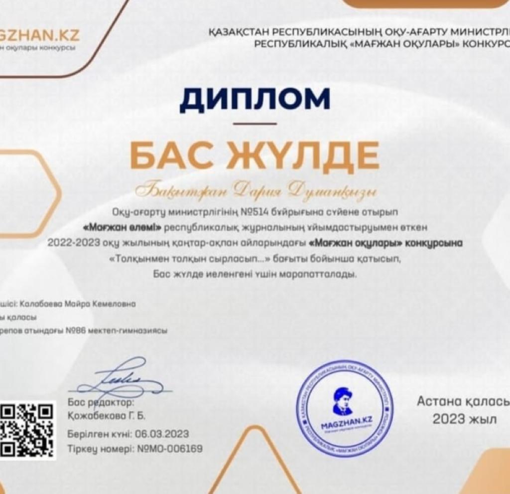 06.03.2023ж. "Мағжан әлемі" республикалық журналының ұйымдастыруымен өткен 2022-2023 оқу жылының қаңтар-ақпан айларындағы "Мағжан оқулары" конкурсына "Толқынмен толқын сырласып...." бағыты бойынша қатысып Бас жүлде иеленген Бақытжан Дария Думанқызы және жетекшісі Калабаева Майраны құттықтаймыз.