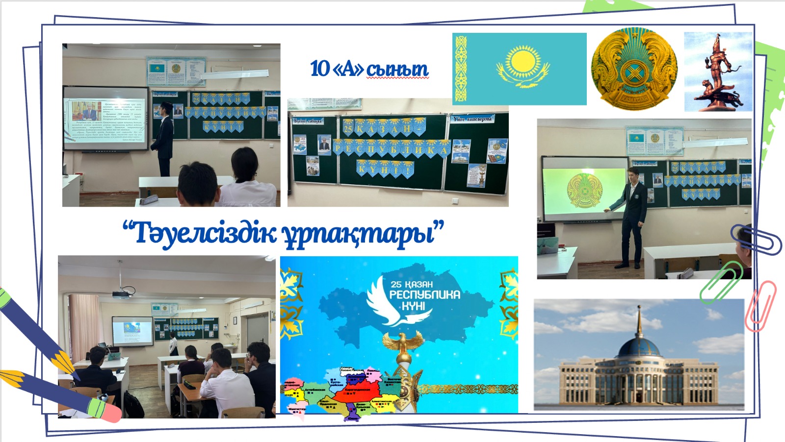 24 октябрь 2023 0 1 2 3 4 5 “Тәуелсіздік ұрпақтары” атты 1-11 сынып сағаттары өткізілді 24 республика күніне орай 24.10.23ж. “Тәуелсіздік ұрпақтары” атты 1-11 сынып сағаттары өткізілді. 08:00 де барлық сыныптарда Мемлекеттік әнұран жалпылай орындалды.