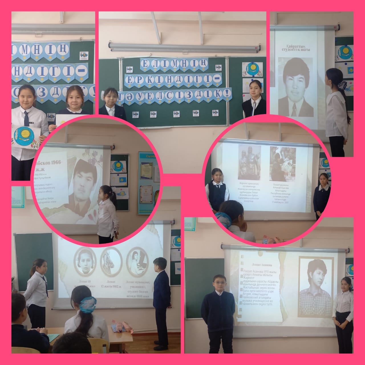 Желтоқсан оқиғасына 37 жыл, Қазақстан Республикасының тәуелсіздігінің 32 жыл толуына орай "Тәуелсіздік - елімнің ерлік жолы" атты іс-шаралар жоспарына сәйкес 1-11 сынып оқушыларының арасында "Елімнің еркіндігі - Тәуелсіздік!" тақырыбында ашық тәрбие сағаттары өткізілді.