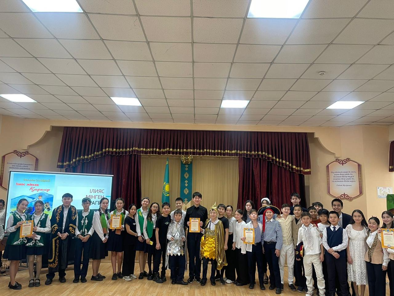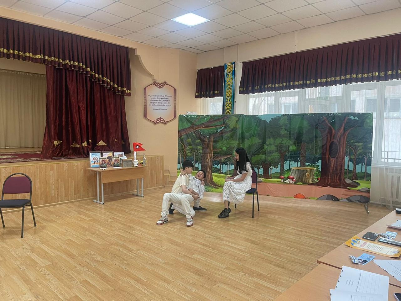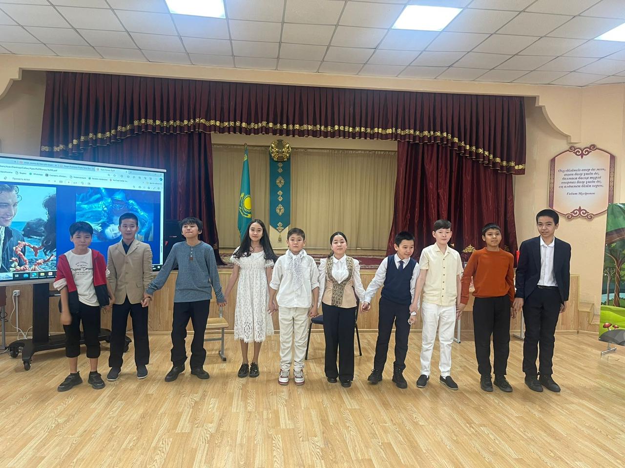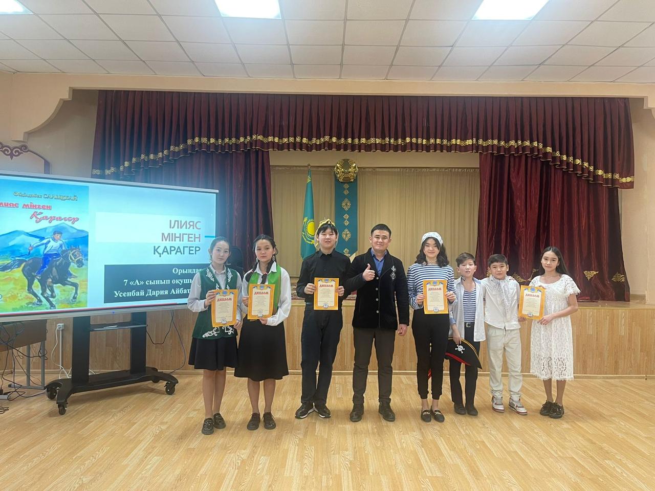 «Мектеп және театр» және «30 кітап, 30 ән» жобасы бойынша 1 – 10 сыныптар арасында оқыған шығарма желісінен сахналық көрініс, сынып болып оқыған кітаптарын еркін форматта жарнамалау бойынша мектепішілік сыныптарда байқауы өткізіліп жатыр. Жоба бойынша 7 - сынып оқушылары берілген кітаптары бойынша буктрейллер қорғап, көрініс көрсетті. Әрбір оқушының сахнаға төселгендіктері, өздерін еркін ұстаулары, берілген рөлді алып шаққандары байқалды