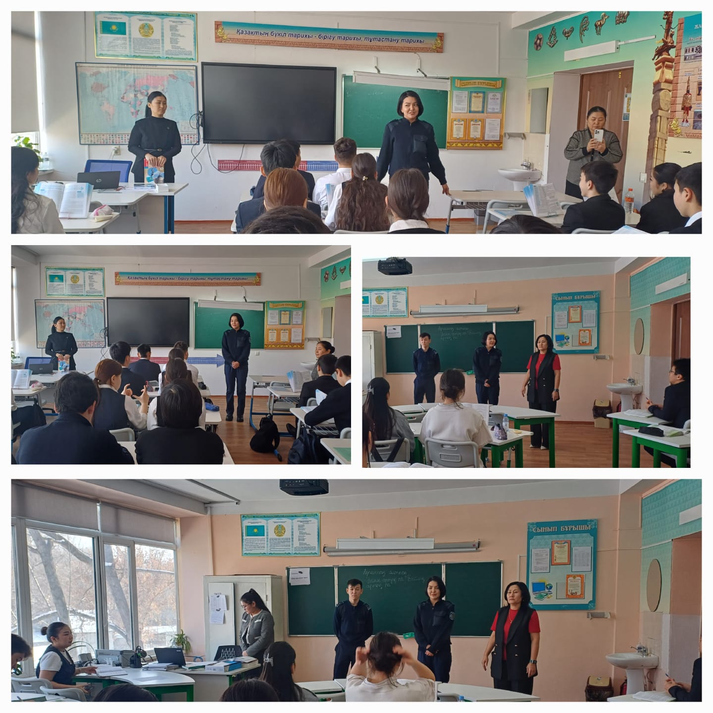 Алматы қаласы, Әуезов ауданы, Ғабит Мүсірепов атындағы №86 мектеп-гимназиясында ЮБП инспекторы, полиция аға лейтенанты Н.Сержанұлы мен ЮБП инспекторы, полиция аға лейтенанты Касымова А.К. 10 сынып оқушылары және сынып жетекшілерінің қатысуымен түсіндірме жұмыстарын жүргізді.