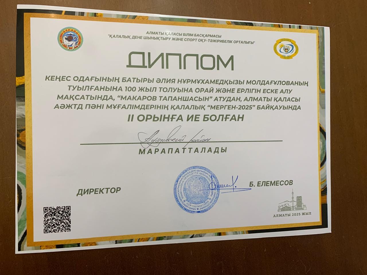 Алматы қаласы білім басқармасы «Қалалық дене шынықтыру және спорт оқу – тәжірбиелік орталығы» Кеңес одағының батыры Әлия Нұрмұхамедқызы Молдағқлованың туылғанына 100 жыл толуына орай және ерлігін еске алу мақсатында, «Макаров тапаншасы» атудан, Алматы қаласы АӘЖТД пәні мұғаләмдерінің қалалық «мерген – 2025» байқауында II орынға ие болған Ғ.Мүсірепов атындағы №86 мектеп-гимназиясының АӘЖТД пәні мұғалімі подполковник Тұрсынұлы Айбар Хамитжановичті құттықтаймыз!!!