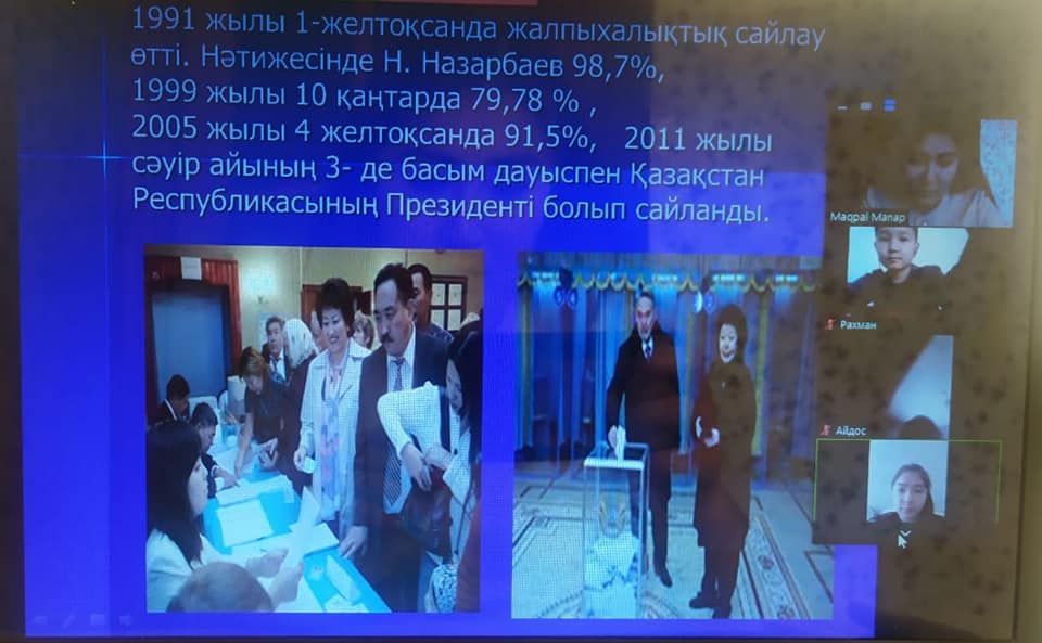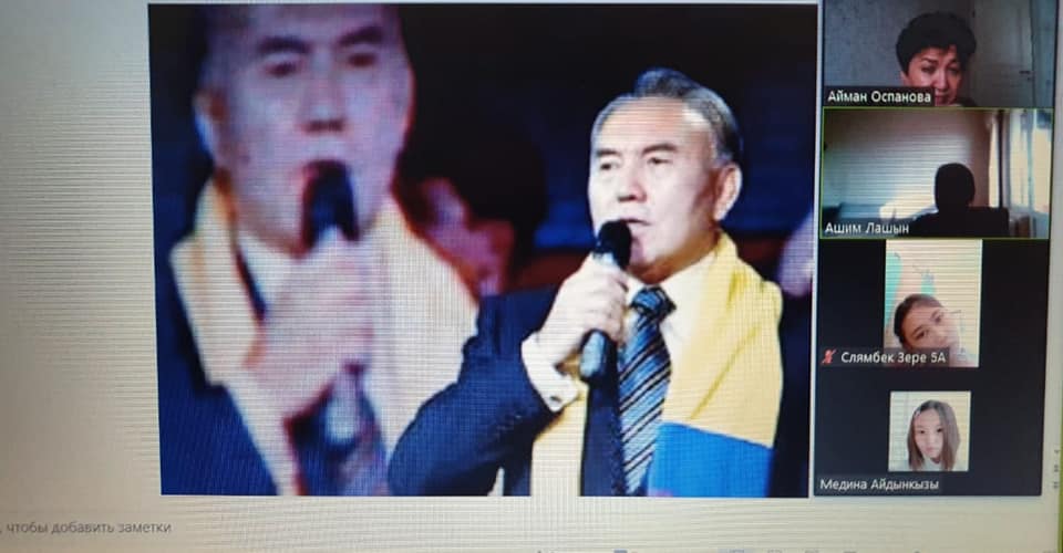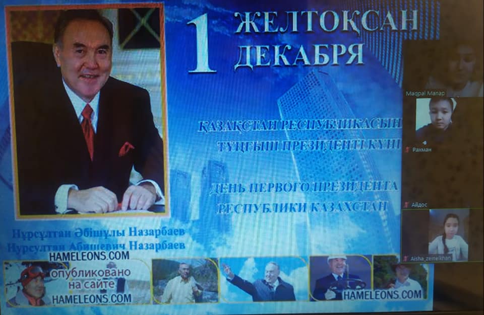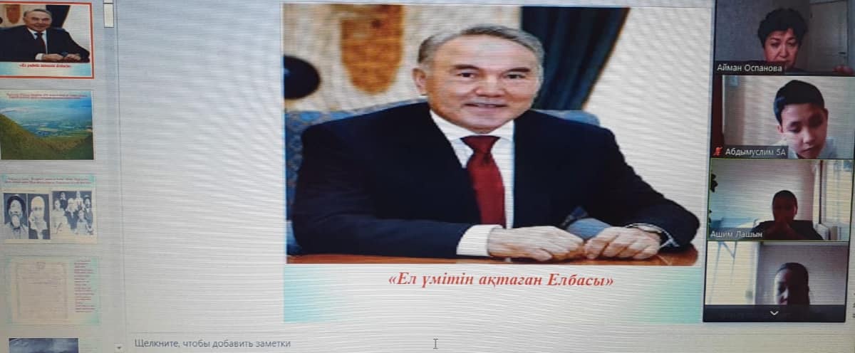 «Ұлы даланың Ұлы көшбасшы» тақырыбында онлайн сынып сағаттары өтті. Сабақтың мақсаты: ҚР Тұңғыш Президент-Елбасы Н.Ә.Назарбаевтың тәуелсіз еліміздің даму жолында атқарған қызметтерімен, көреген көшбасшылығымен, саясатының маңыздылығын өскелең ұрпаққа паш етіп, тереңірек таныстыру. Оқушыларымызды отансүйгіштікке, шынайы көшбасшылыққа тәрбиелеу. Жүргізілген іс -шара барысында оқушылар Елбасының балалық шағы, өмір жолы туралы туралы білімдерін кеңейтіп, таныстырылымдар мен көркем фильмдерді тамашалау арқылы Н.Ә.Назарбаевтың халқына сіңірген еңбегі туралы ақпараттармен танысты. Оқушылар Елбасы, Отан тақырыптарында өлеңдер оқып, ән шырқады.