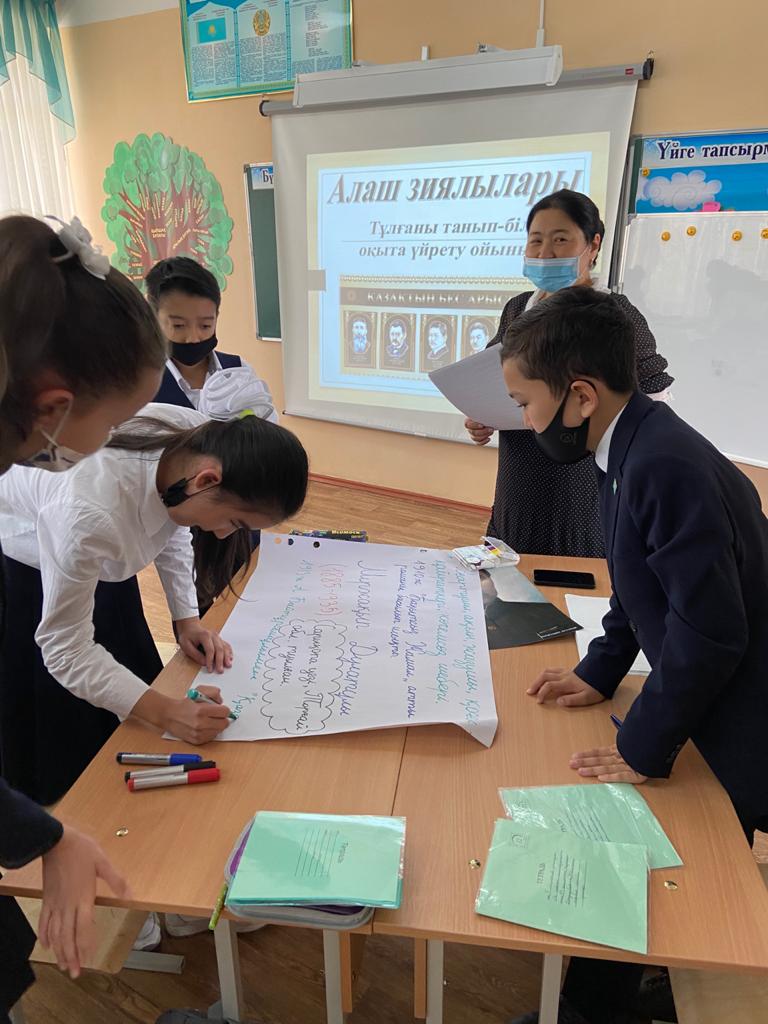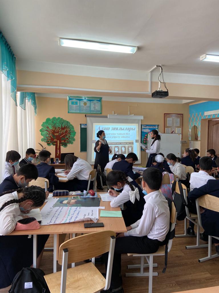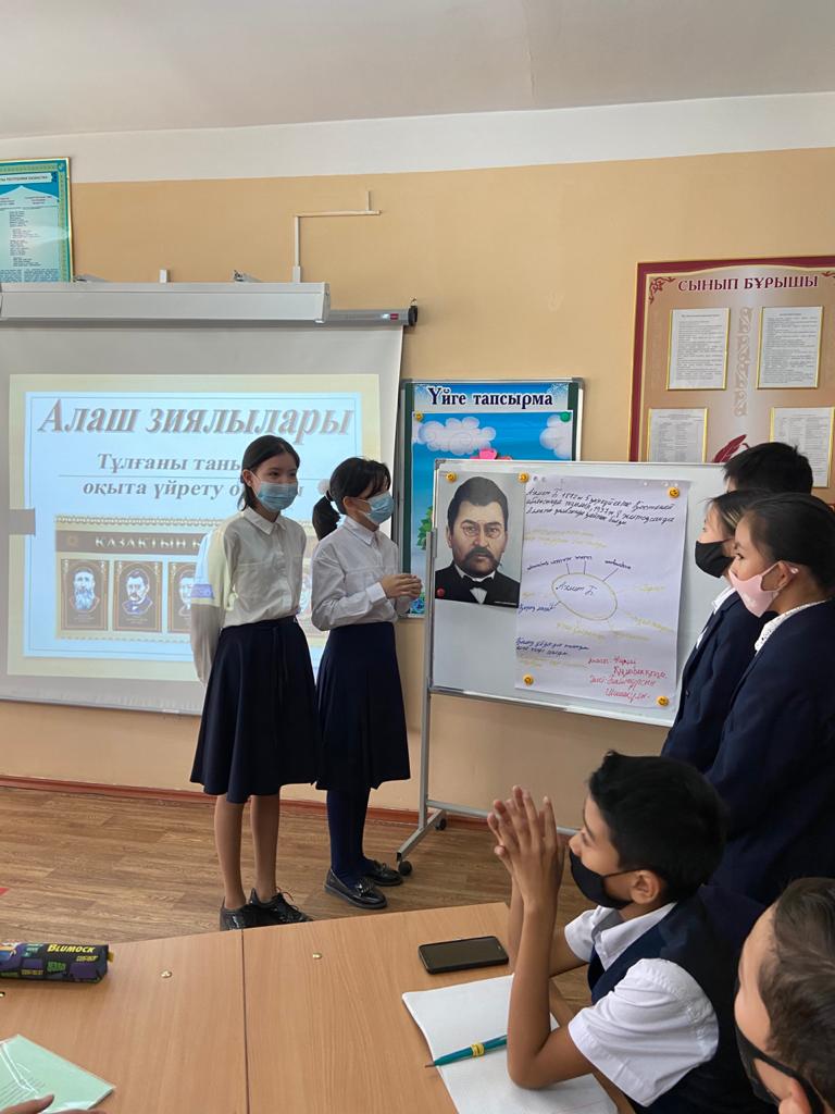 Қазақ тілі мен әдебиеті пәнінің мұғалімі Б.Досқазиеваның 7 "А" сыныбымен өткен "Алаш зиялылары"тақырыбында тұлғаны
