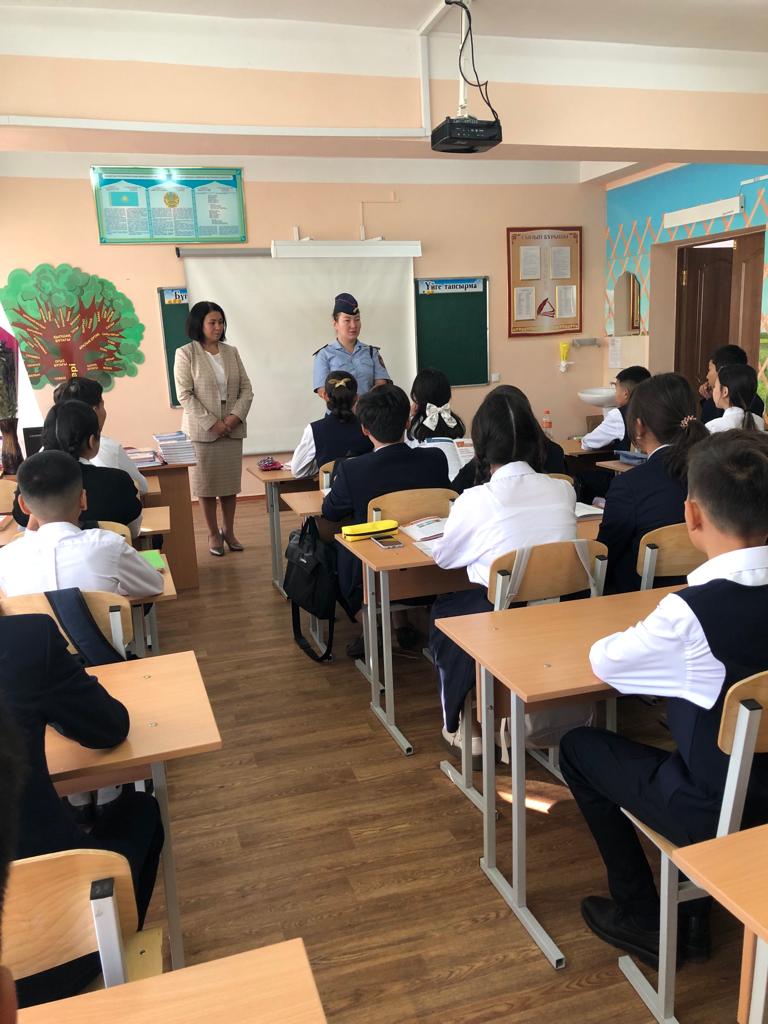 8-10 сыныптар арасында «Құқықбұзушылық және жауапкершілік» тақырыбында профилактикалық әңгіме жұмыстары жүргізілді. Оқушыларға өмір қауіпсіздігін қамтамасыз ету, құқық бұзушылықтың алдын алу мектеп және көшедегі тәртіпті сақтаудан басталатындығы айтып түсіндірілді. Оқушылардың сұрақтарына жауап берді.