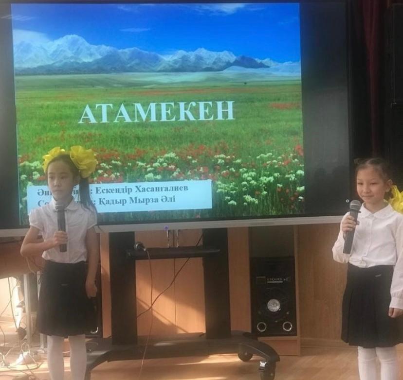 2 «Г» сыныбы Е.Хасанғалиевтың, Қ.Мырзылиевтың «Атамекен» әнді хормен айтып,қыздар жарнамалады.