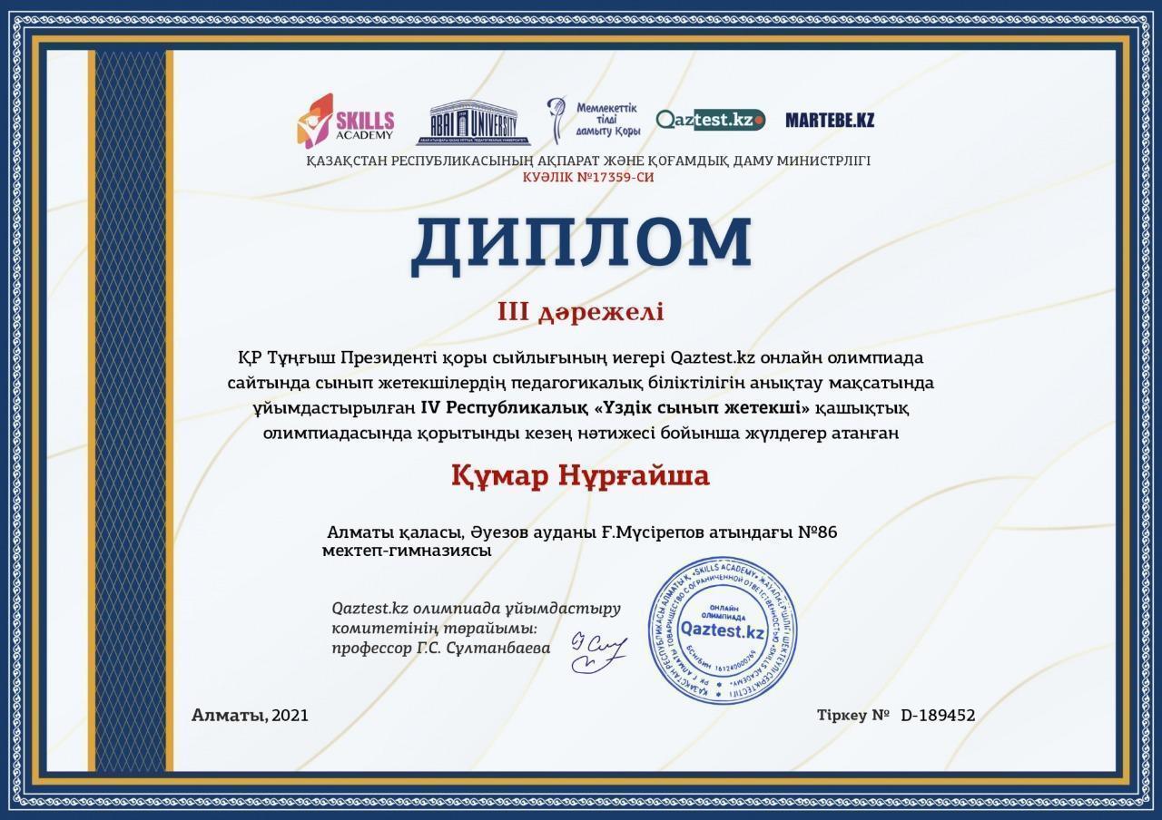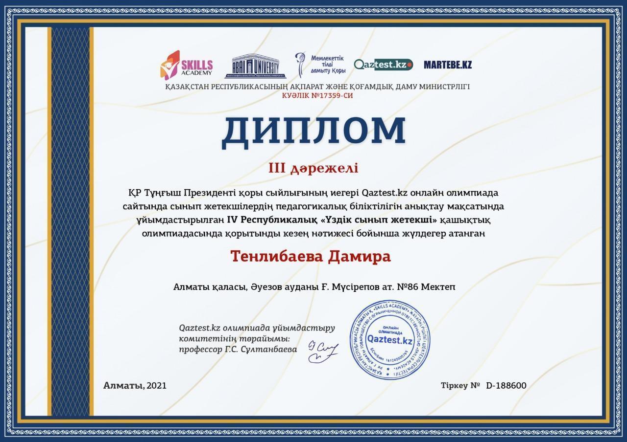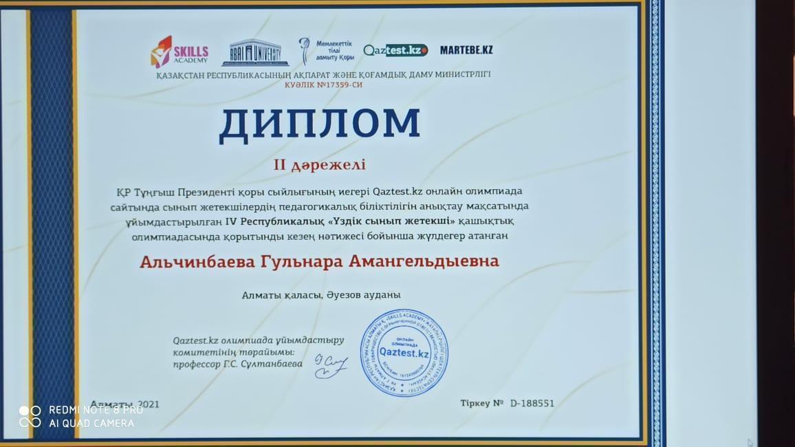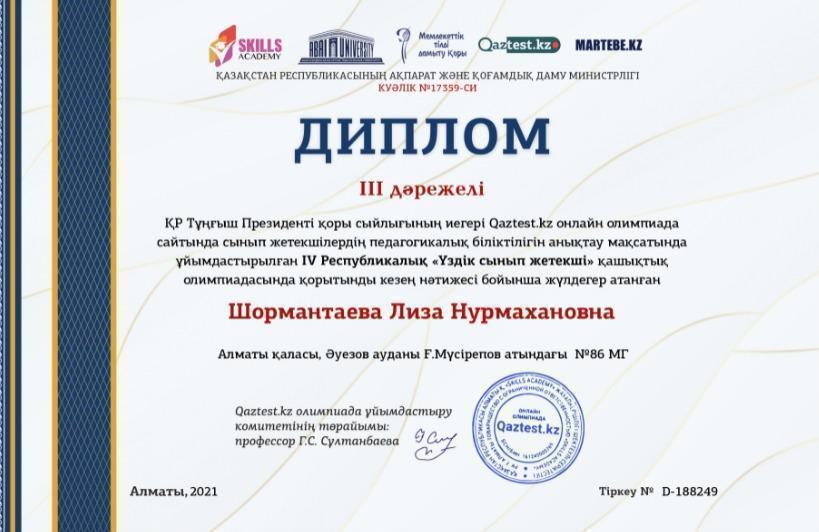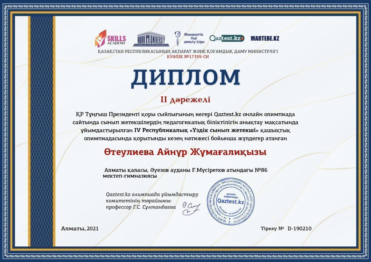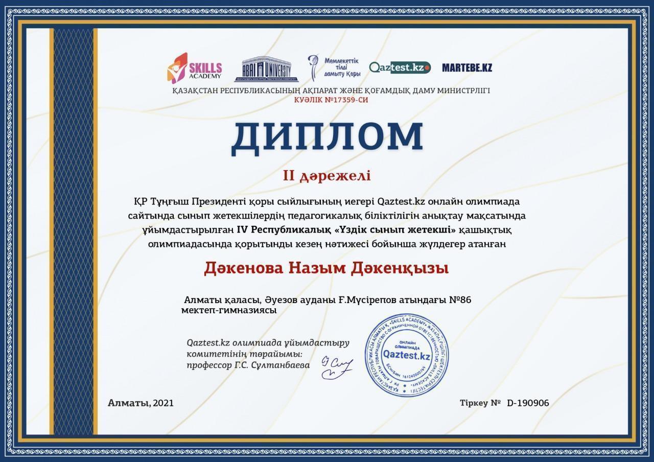 IV Республикалық "Үздік сынып жетекші" олимпиадасы Алматы қаласы, Әуезов ауданы Ғ.Мүсірепов атындағы №86 мектеп-гимназиясы "Үздік ұжым" номинациясымен марапатталды