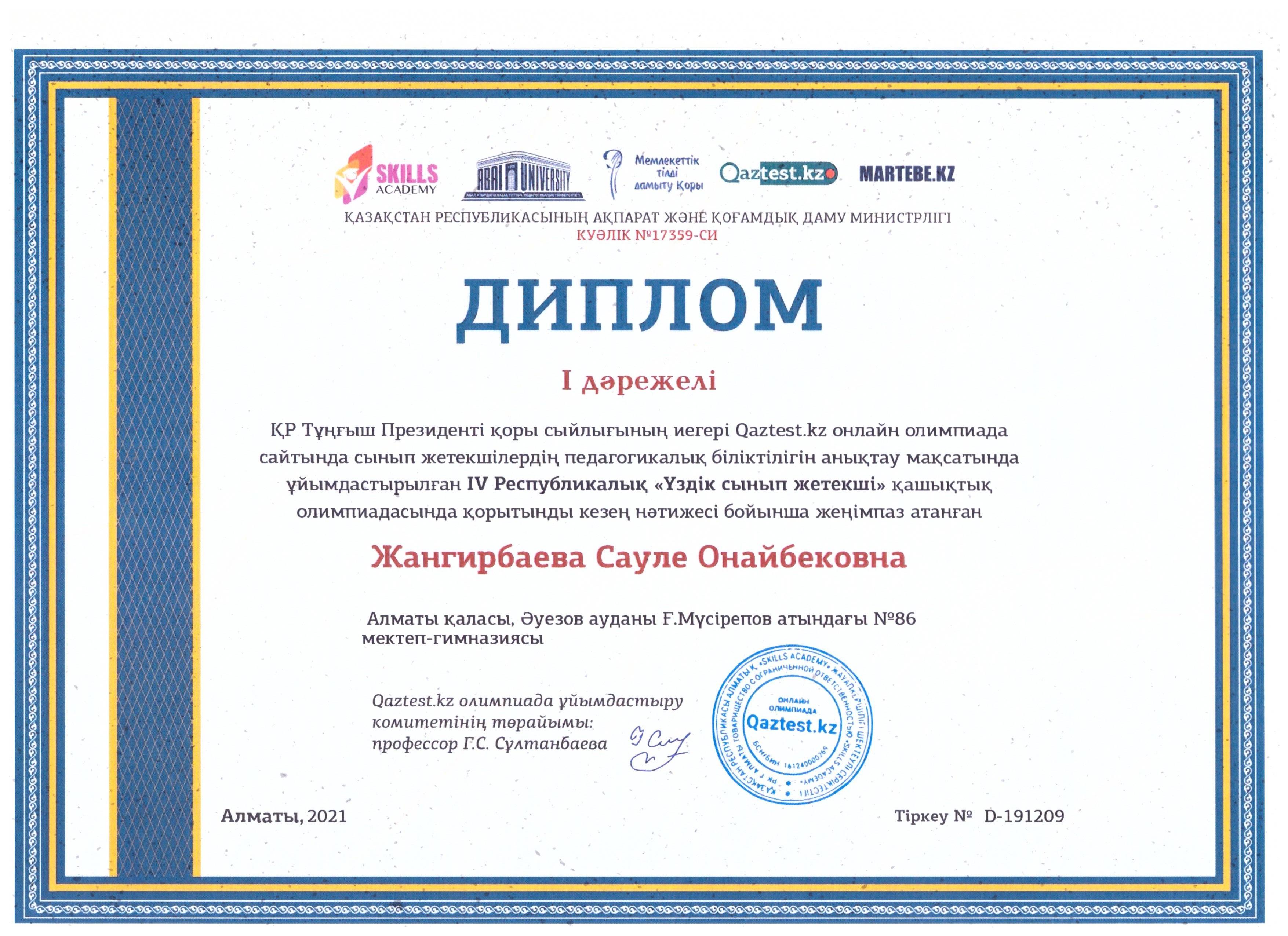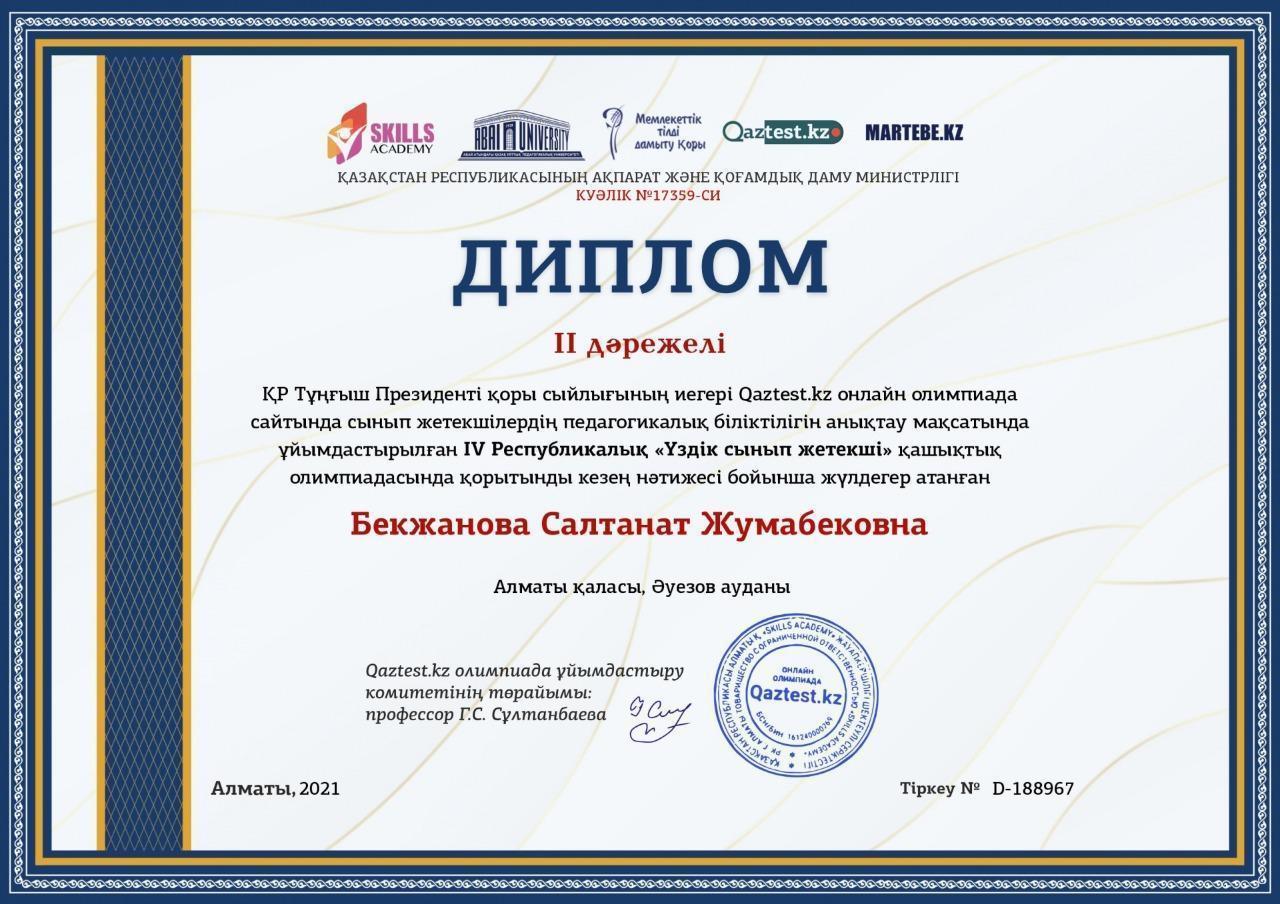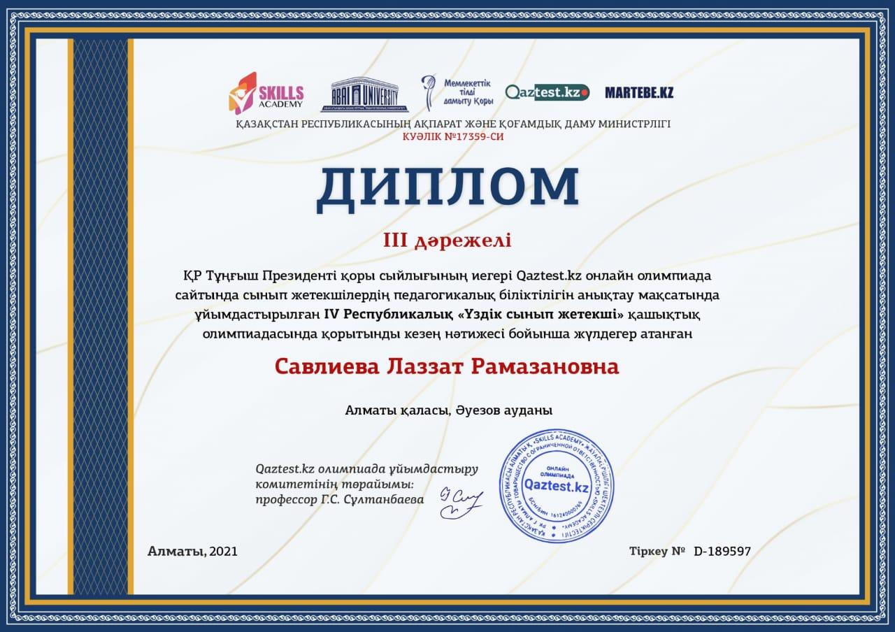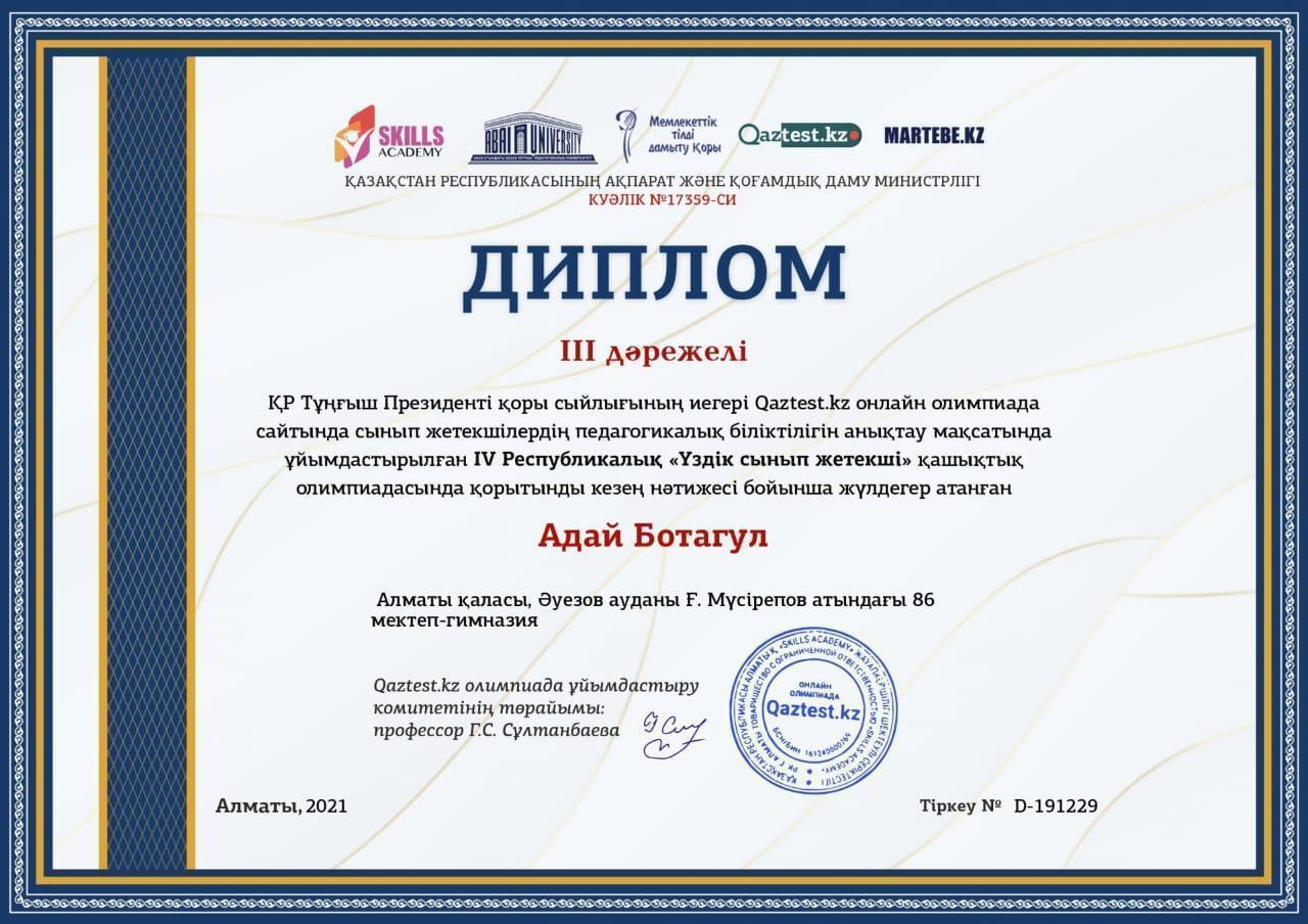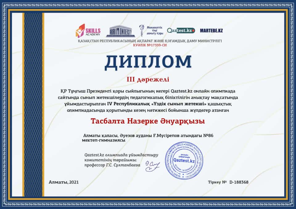 IV Республикалық "Үздік сынып жетекші" олимпиадасы Алматы қаласы, Әуезов ауданы Ғ.Мүсірепов атындағы №86 мектеп-гимназиясы "Үздік ұжым" номинациясымен марапатталды