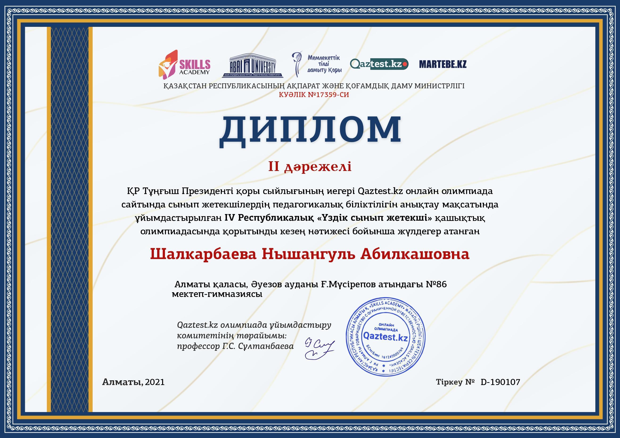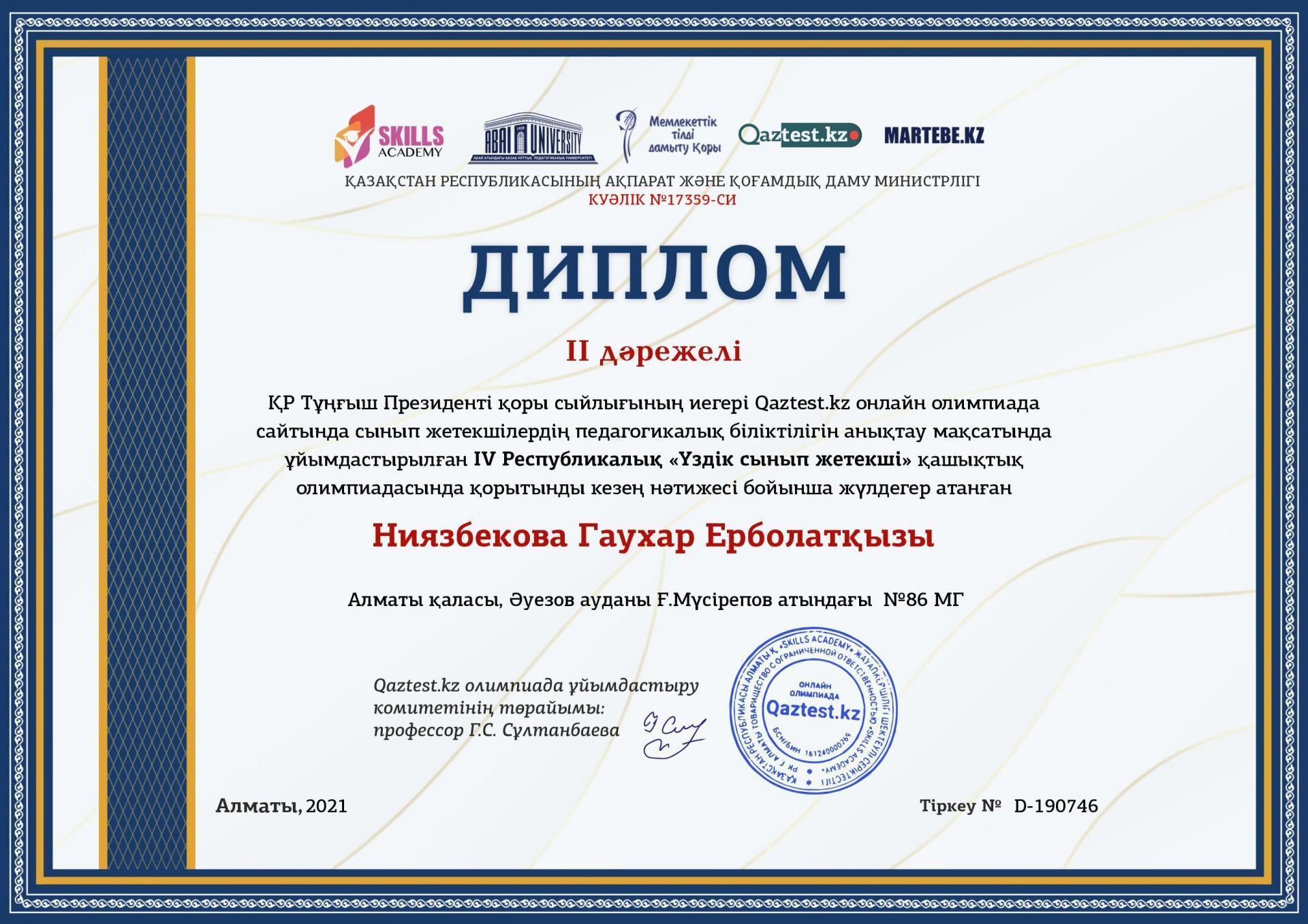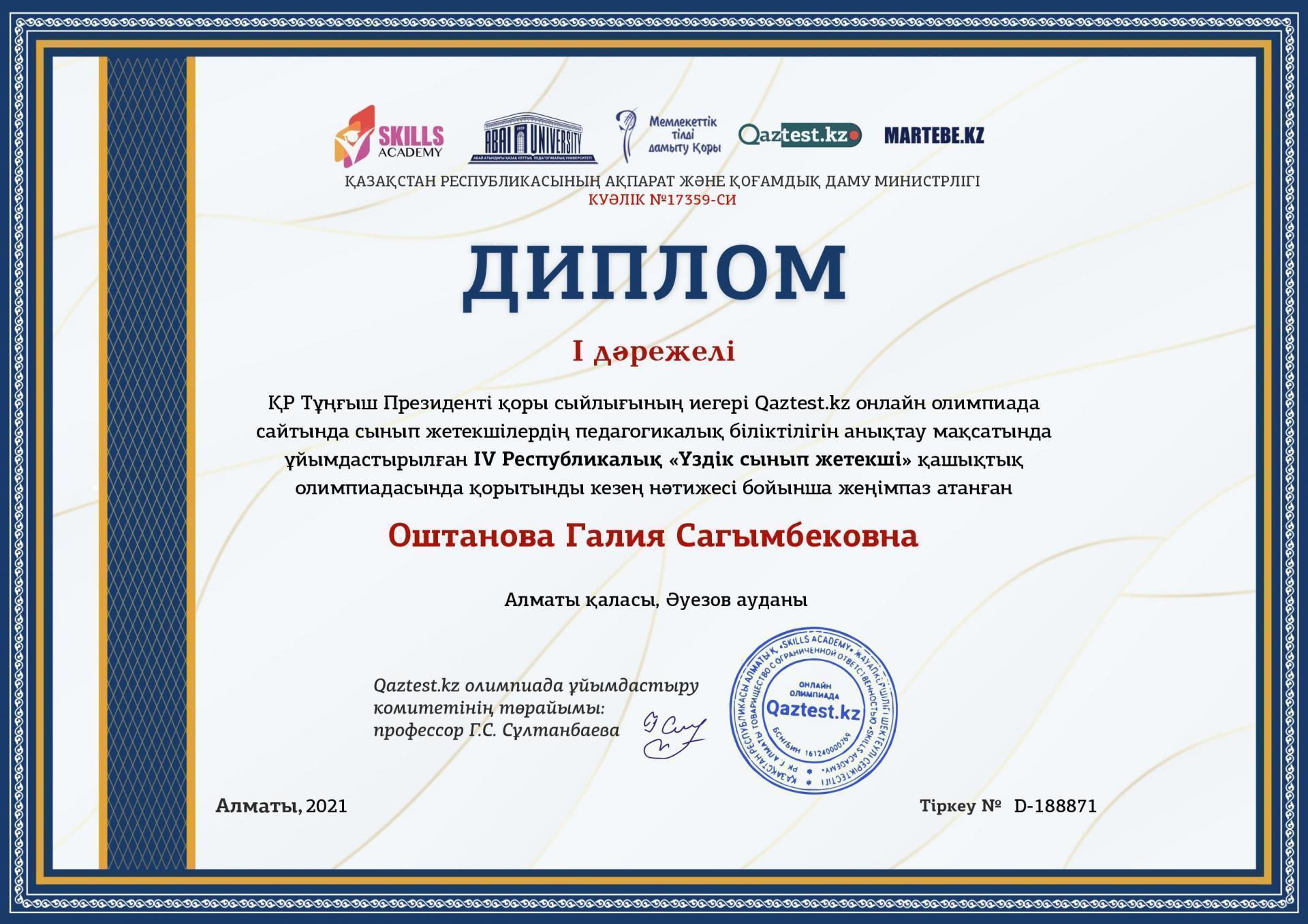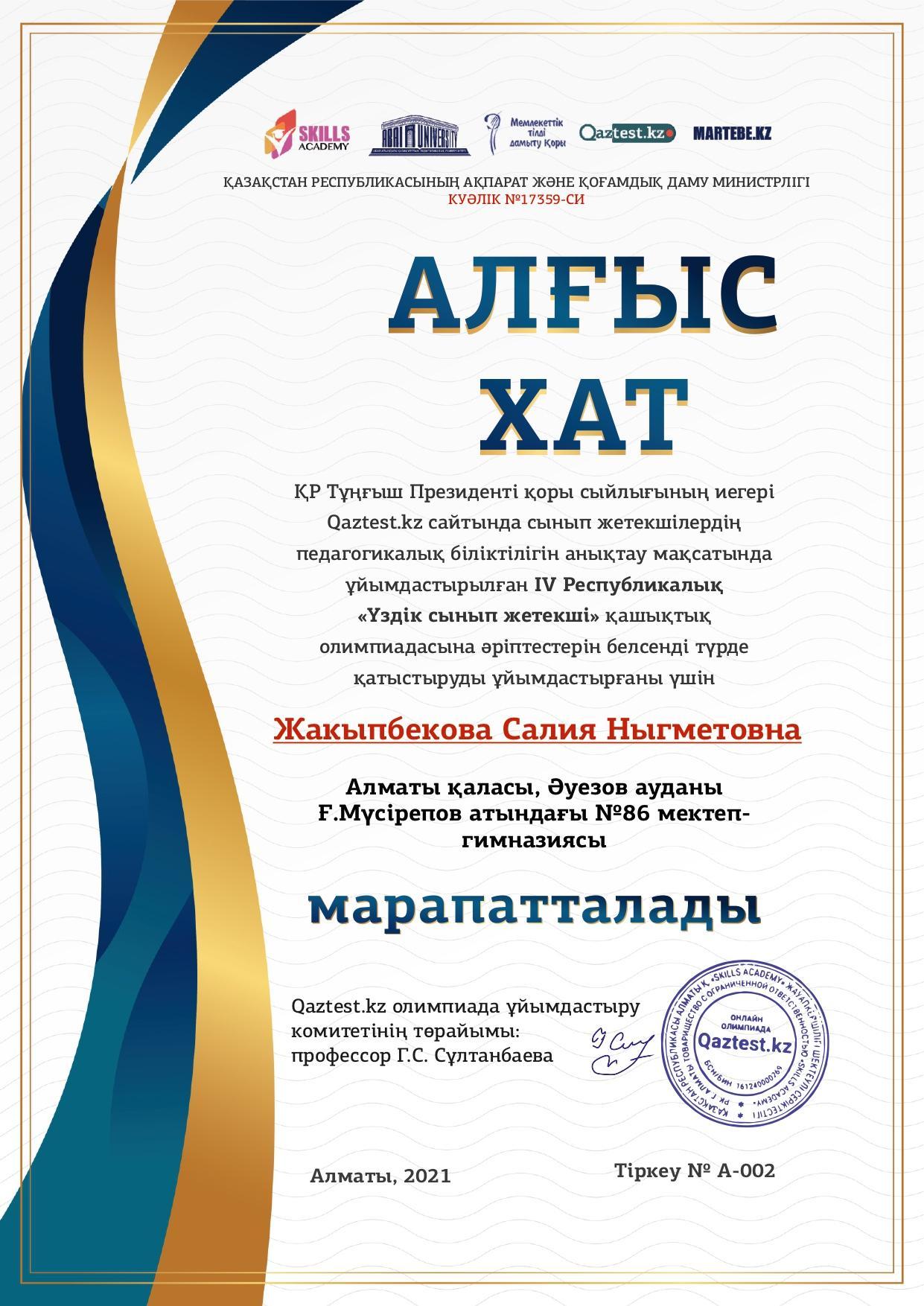 IV Республикалық "Үздік сынып жетекші" олимпиадасы Алматы қаласы, Әуезов ауданы Ғ.Мүсірепов атындағы №86 мектеп-гимназиясы "Үздік ұжым" номинациясымен марапатталды