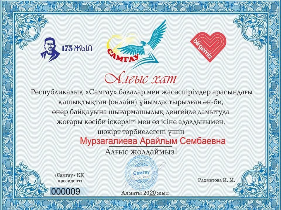 04 февраль 2021 0 1 2 3 4 5 Шығармашылық жетістіктеріміз Республикалық "Самғау" балалар мен жасөспірімдер арасында ұйымдастырылған ән-би, өнер байқауында "Хореография"жанры бойынша үздік өнер көрсеткен "Әдемі-ай"би тобы жетекшісі Мурзагалиева Арайлым