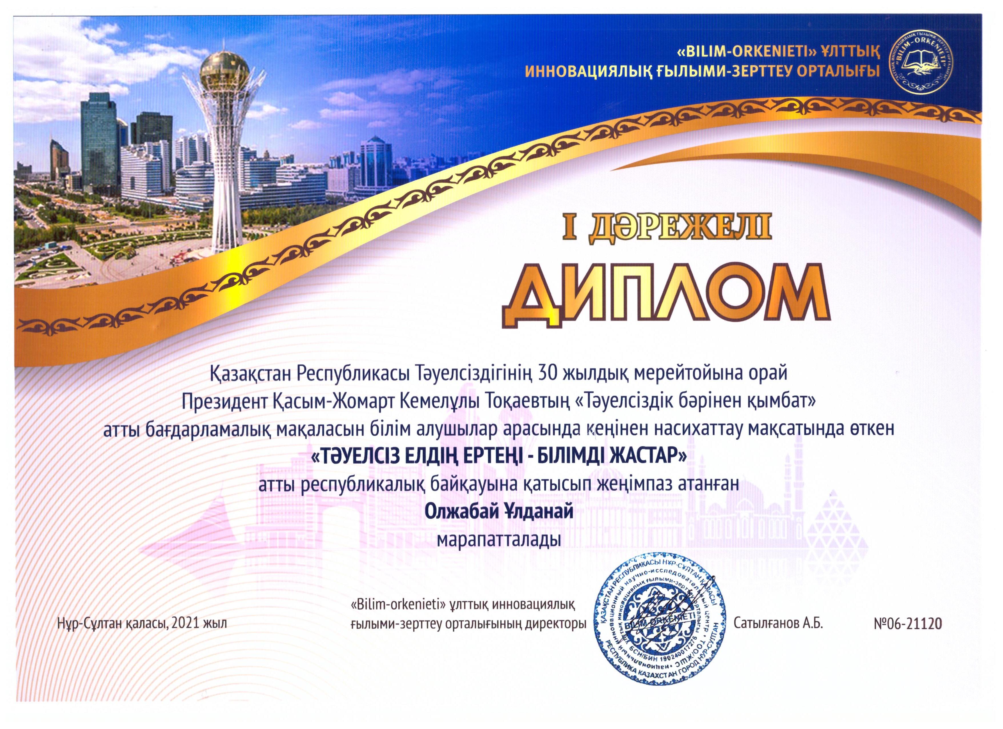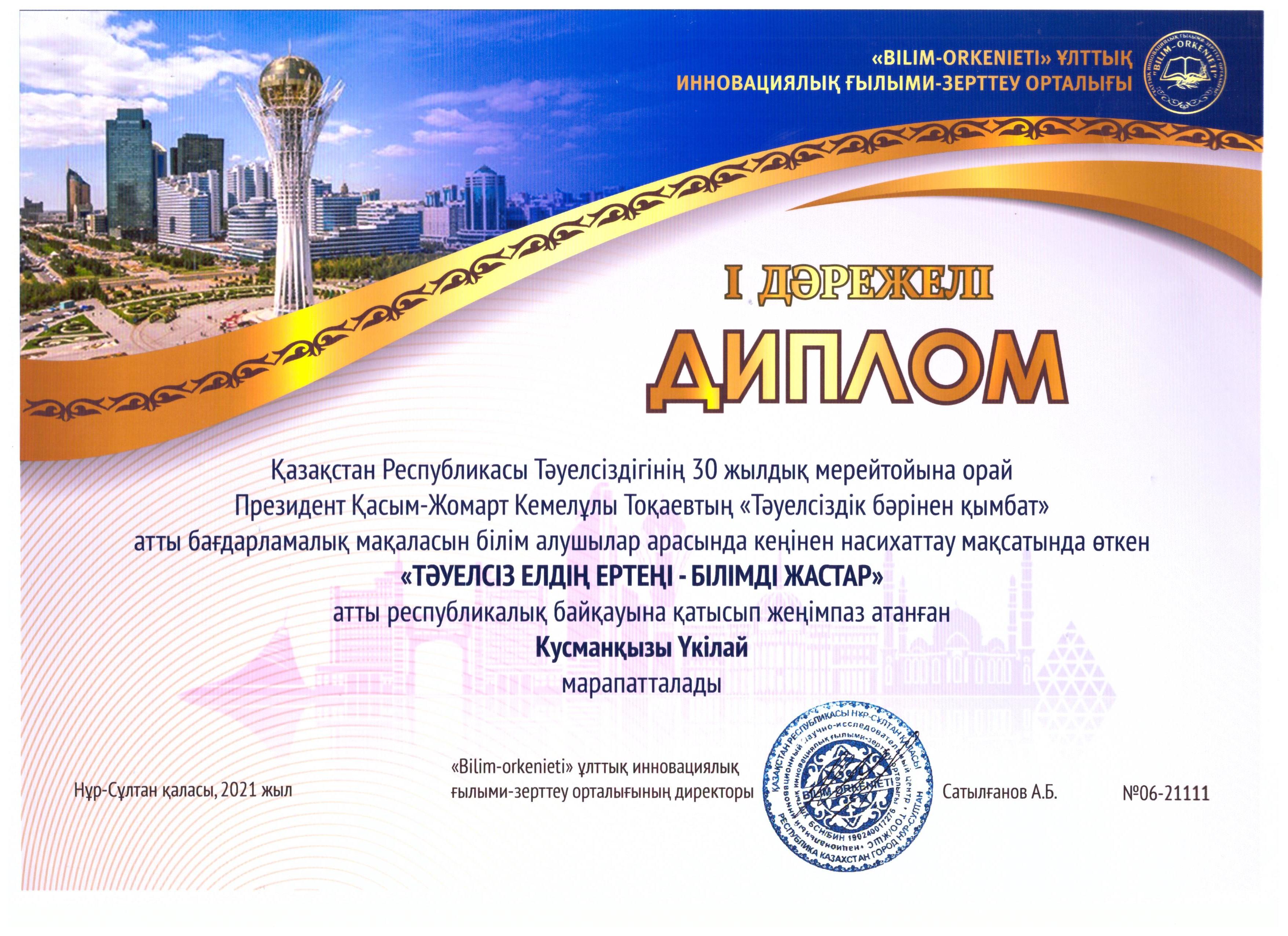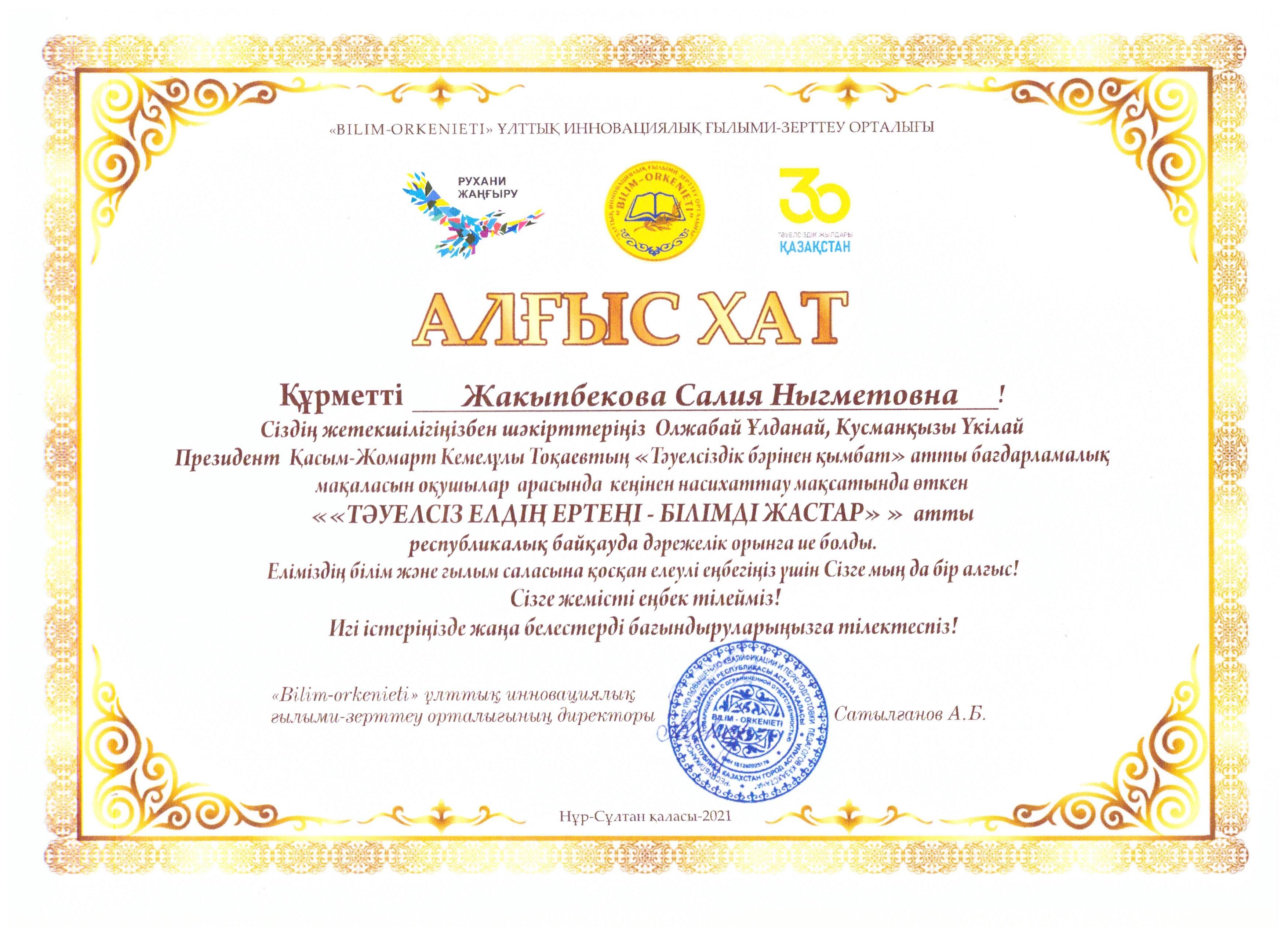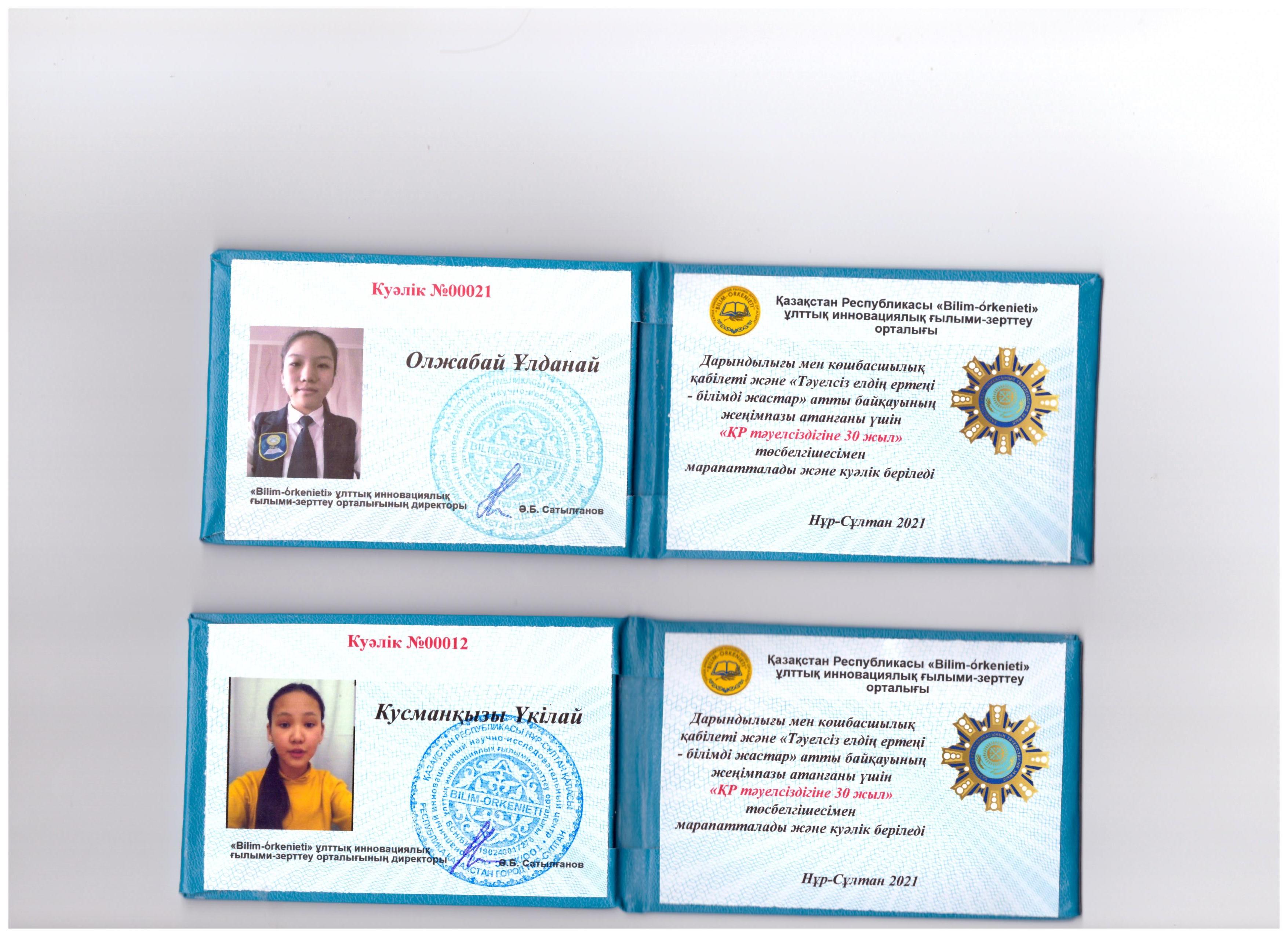 "BILIM-ORKENIETI" Ұлттық инновациялық ғылыми зерттеу орталығы ұйымдастырған "Тәуелсіз елдің ертеңі-білімді жастар" атты республикалық байқауының материалдары жинағына 9 "В" сынып оқушылары Кусманқызы Үкілай мен Олжабай Ұлданайдың "Өзге тілдің бәрін біл-өз тіліңді құрметте" тақырыбындағы эсселері жарияланды. Тәуелсіз еліміздің ертеңі білімді ұрпақтарды тәрбиелеуде ат салысқан директордың тәрбие ісі жөніндегі орынбасары Жакыпбекова Сәлия Нығметқызы жас ұрпақтың бойына рухани адамгершілік пен патриоттық құндылықтарды сіңіруде еңбек етуде.