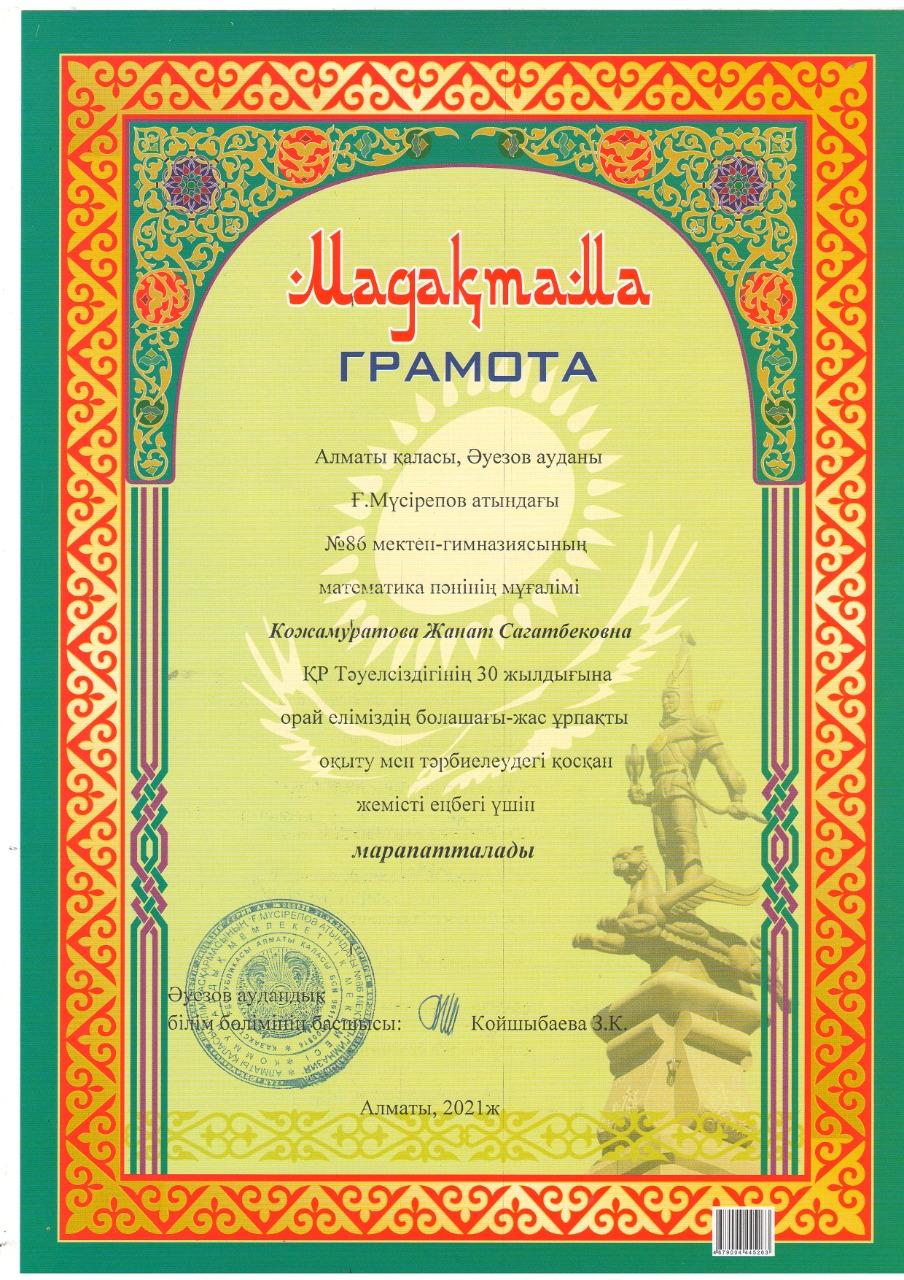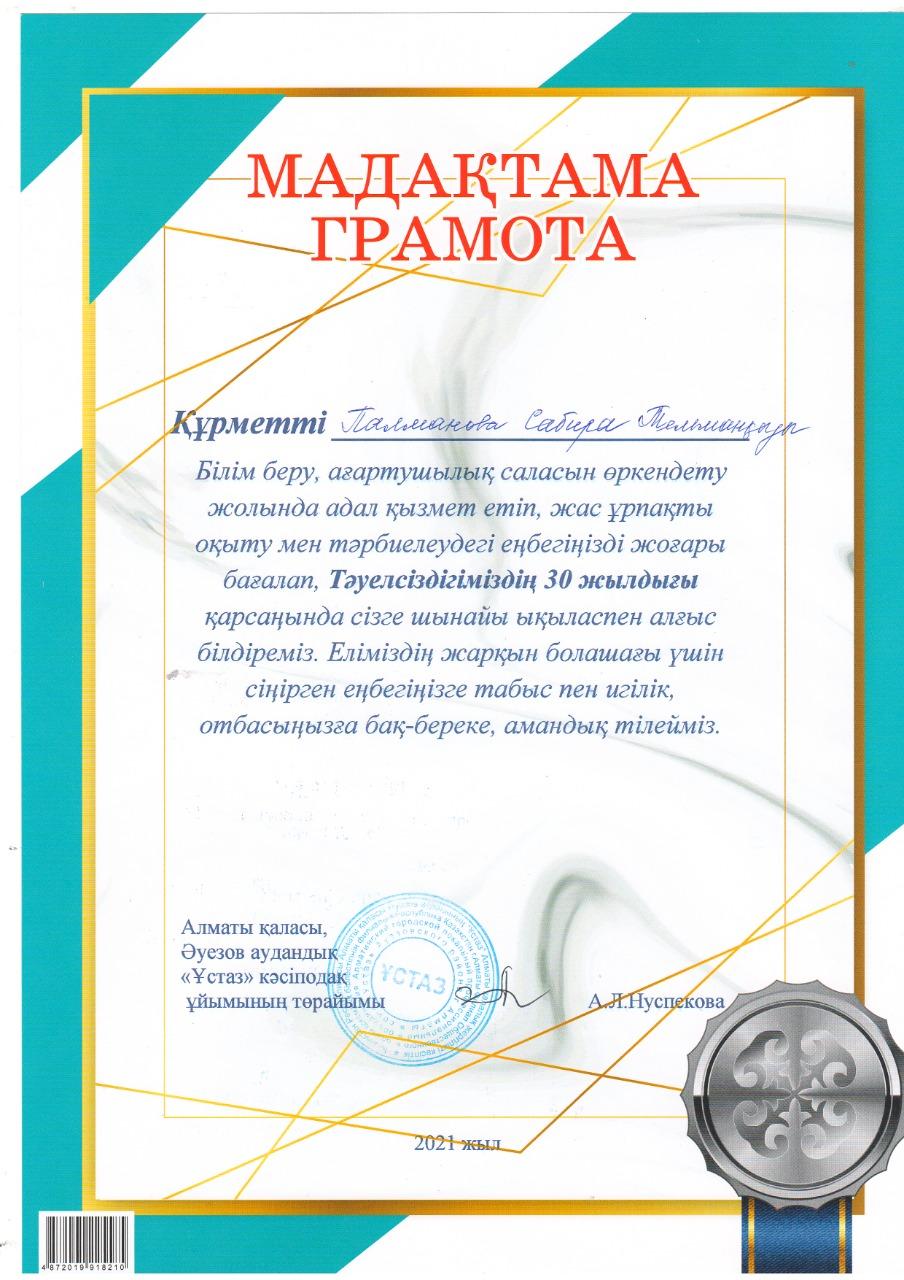 18 декабрь 2021 0 1 2 3 4 5 Тәуелсіздіктің 30 жылдығы қарсаңында мектеп ұстаздары аудандық білім бөлімі мен кәсіподақ ұйымының мадақтамаларымен марапатталды Ұстаздарымызға шығармашылық табыс тілейміз!!!