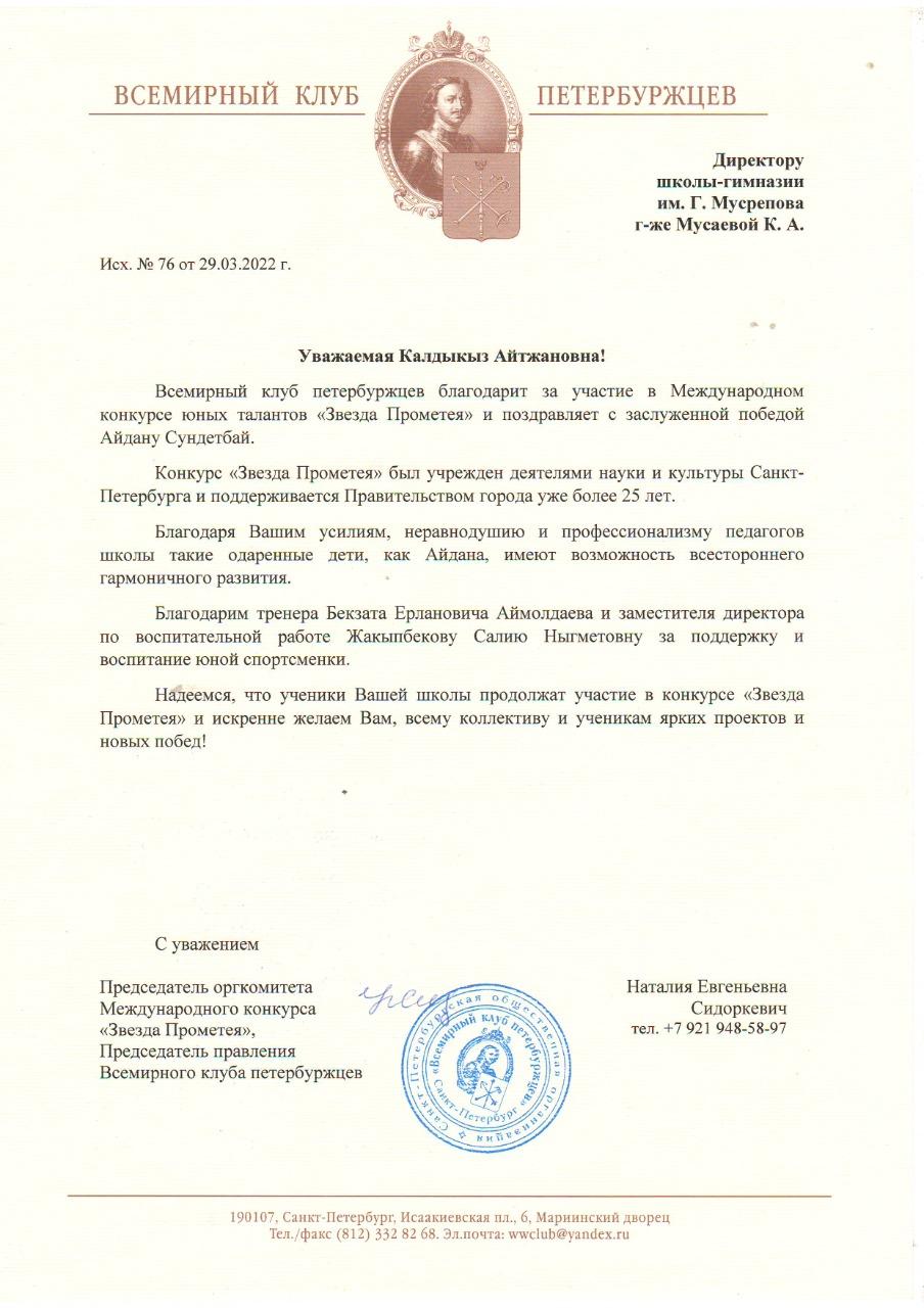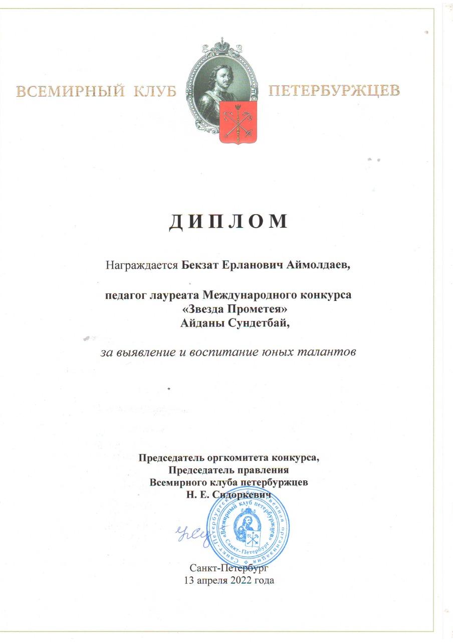 Талантты, дарынды оқушыларымызды қолдау, басқа оқушыларға үлгі өнеге тұту мақсатында биылғы 2021-2022 оқу жылында директордың тәрбие ісі орынбасары Салия Нығметқызының бастамасымен мектеп әкімшілігі 9 «В» сынып оқушысы Сүндетбай Айдананы Санкт-Петербургте өтетін «ПРОМЕТЕЙ ЖҰЛДЫЗЫ» Халықаралық жас таланттар байқауына ұсынған болатын. Байқау жас таланттарды, олардың білімге, рухани мұратқа ұмтылуын қолдау мақсатында өткізіледі. Жоба 1996 жылы Санкт-Петербургтің көрнекті ғылым және мәдениет қайраткерлерінің, оның ішінде Дүниежүзілік Петербургтіктер клубының президенті, Мемлекеттік Эрмитаждың бас директоры М.Б. Пиотровскийдің бастамасымен 26 жыл көлемінде жүзеге асырылып келеді. «Прометей жұлдызы» ресейлік және халықаралық олимпиадаларда, байқауларда өзін танытқан 14-17 жас аралығындағы балаларға беріледі. Жеңімпаздар «Ғылым», «Ғылыми-техникалық шығармашылық», «Жас көшбасшы», «Спорт», «Журналистика» атты бес номинация бойынша анықталады.