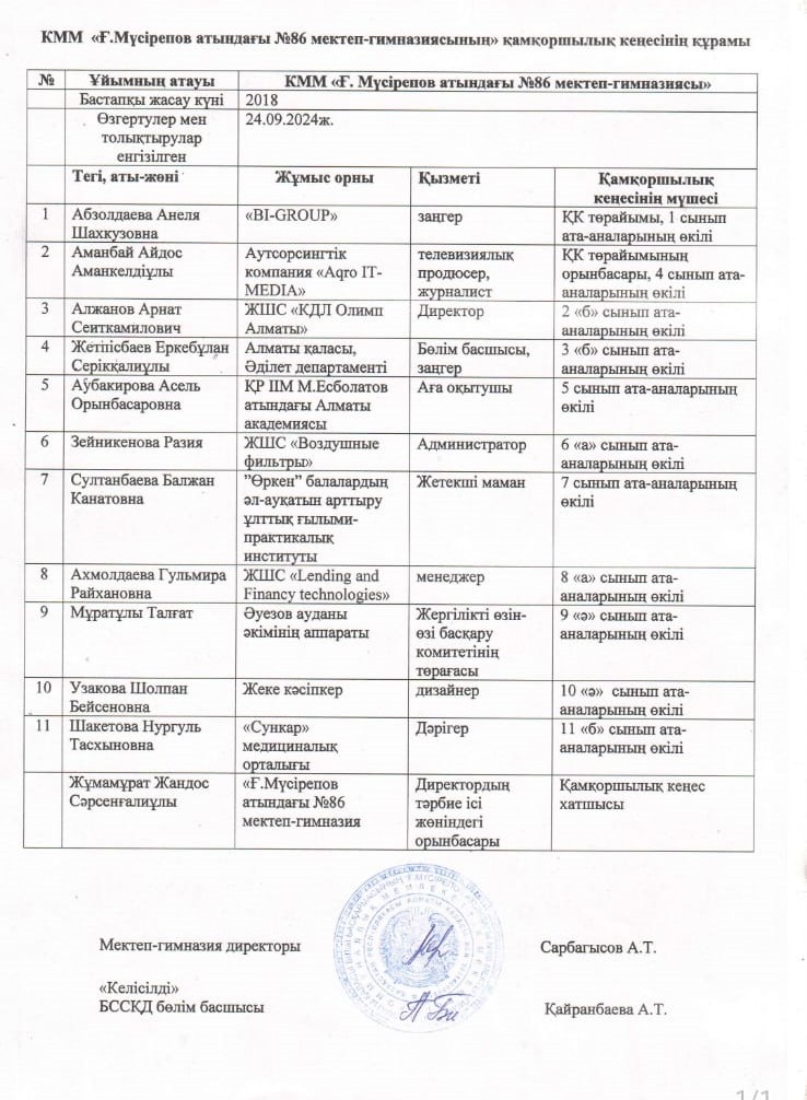 03 октябрь 2024 0 1 2 3 4 5 КММ "Ғ.Мүсірепов атындағы №86 мектеп-гимназиясының" қамқоршылық кеңесінің құрамы