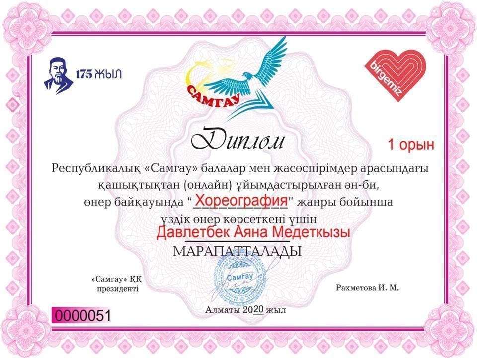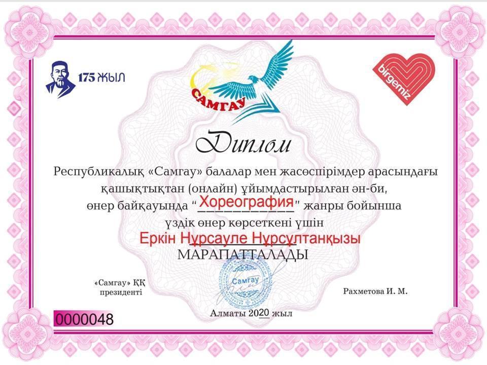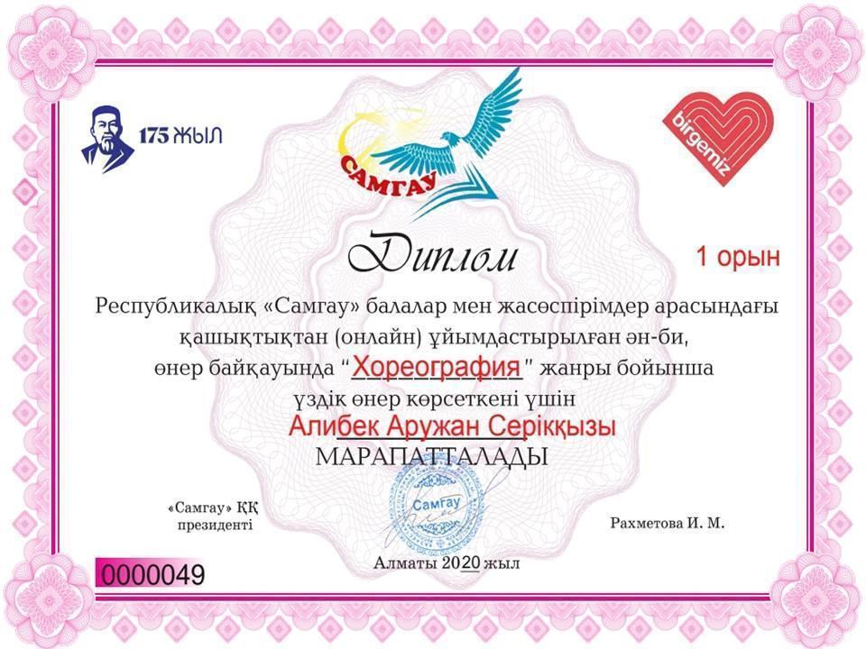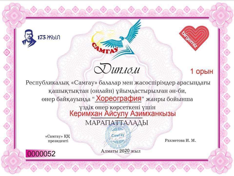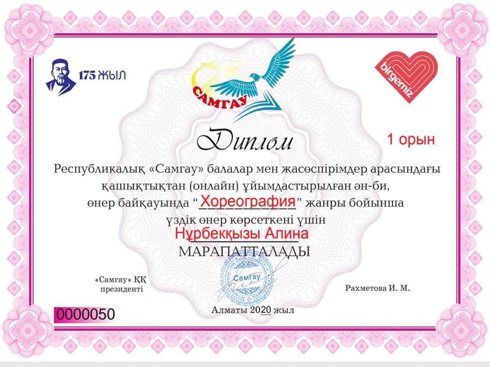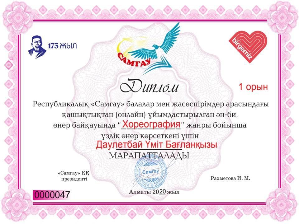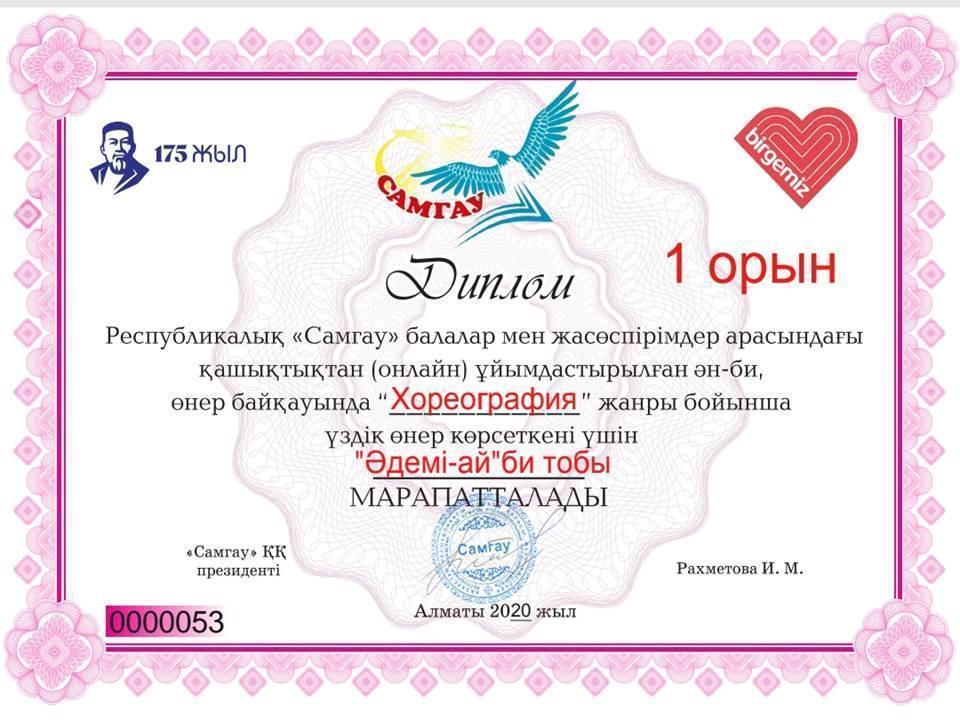 04 февраль 2021 0 1 2 3 4 5 Мектеп би үйірмесіне қатысатын оқушылар жетістігі Республикалық "Самғау" балалар мен жасөспірімдер арасында ұйымдастырылған ән-би, өнер байқауында "Хореография"жанры бойынша үздік өнер көрсеткен "Әдемі-ай"би тобының марапаттары. Үйірме жетекшісі: Мурзагалиева Арайлым