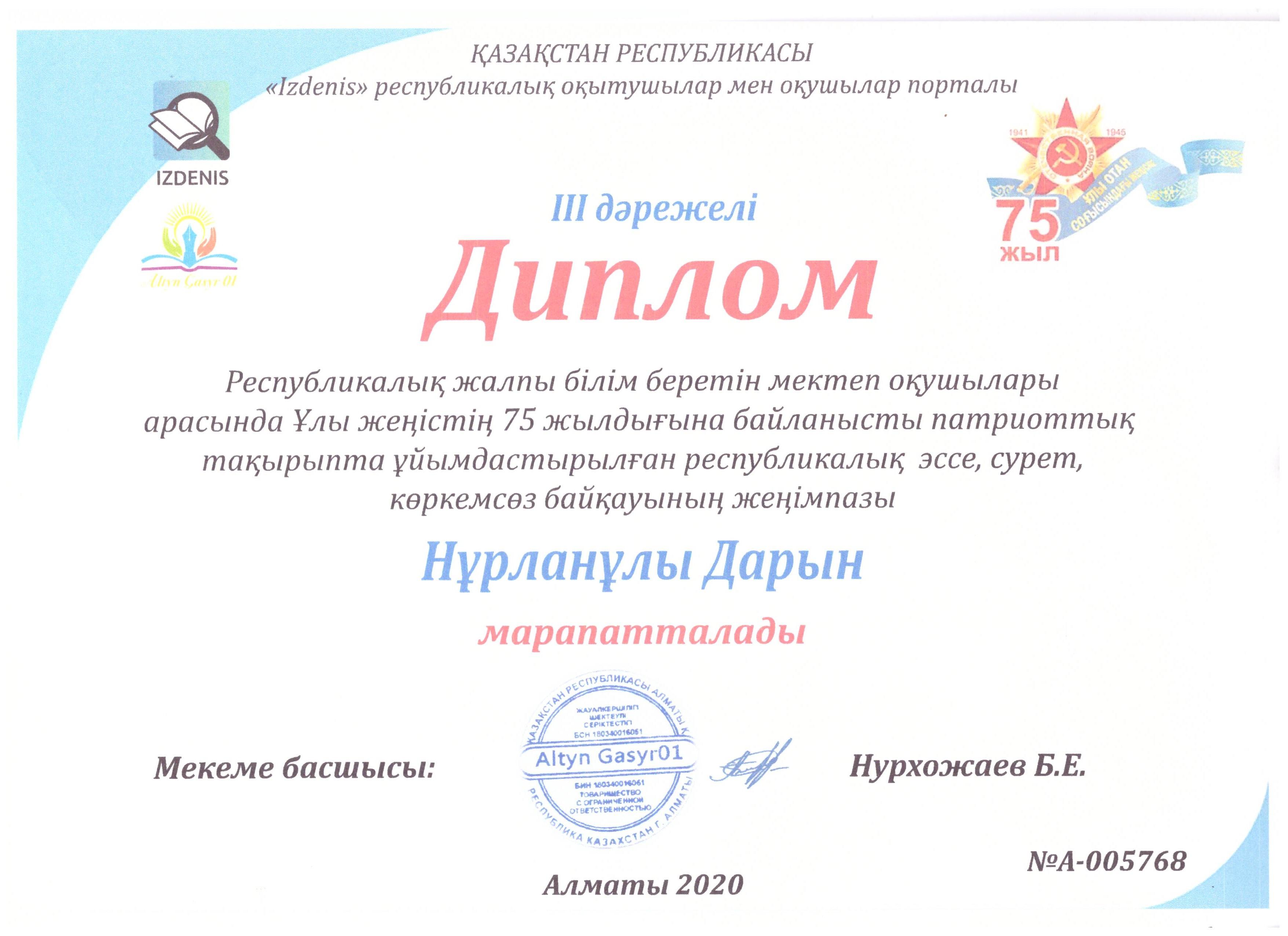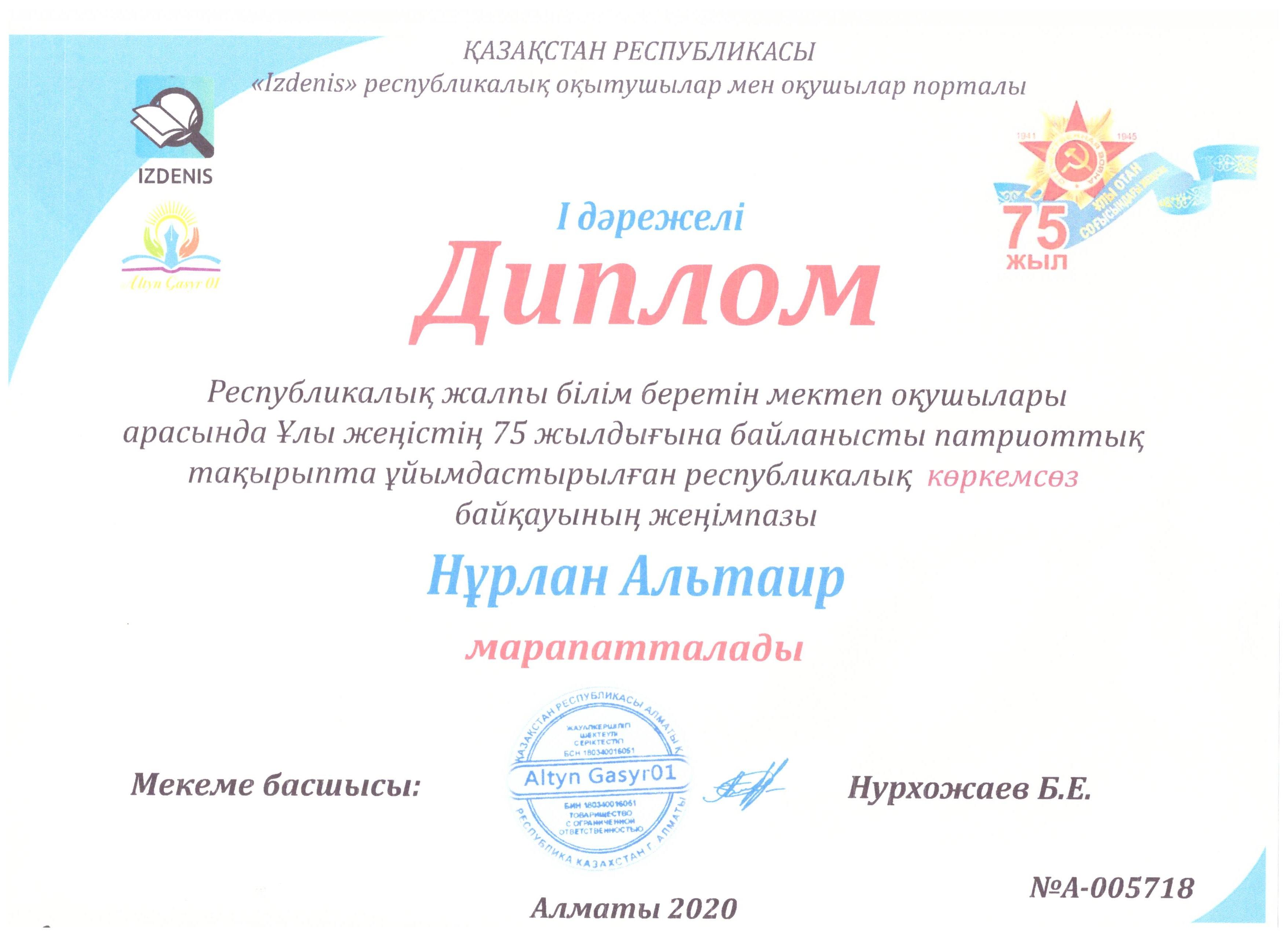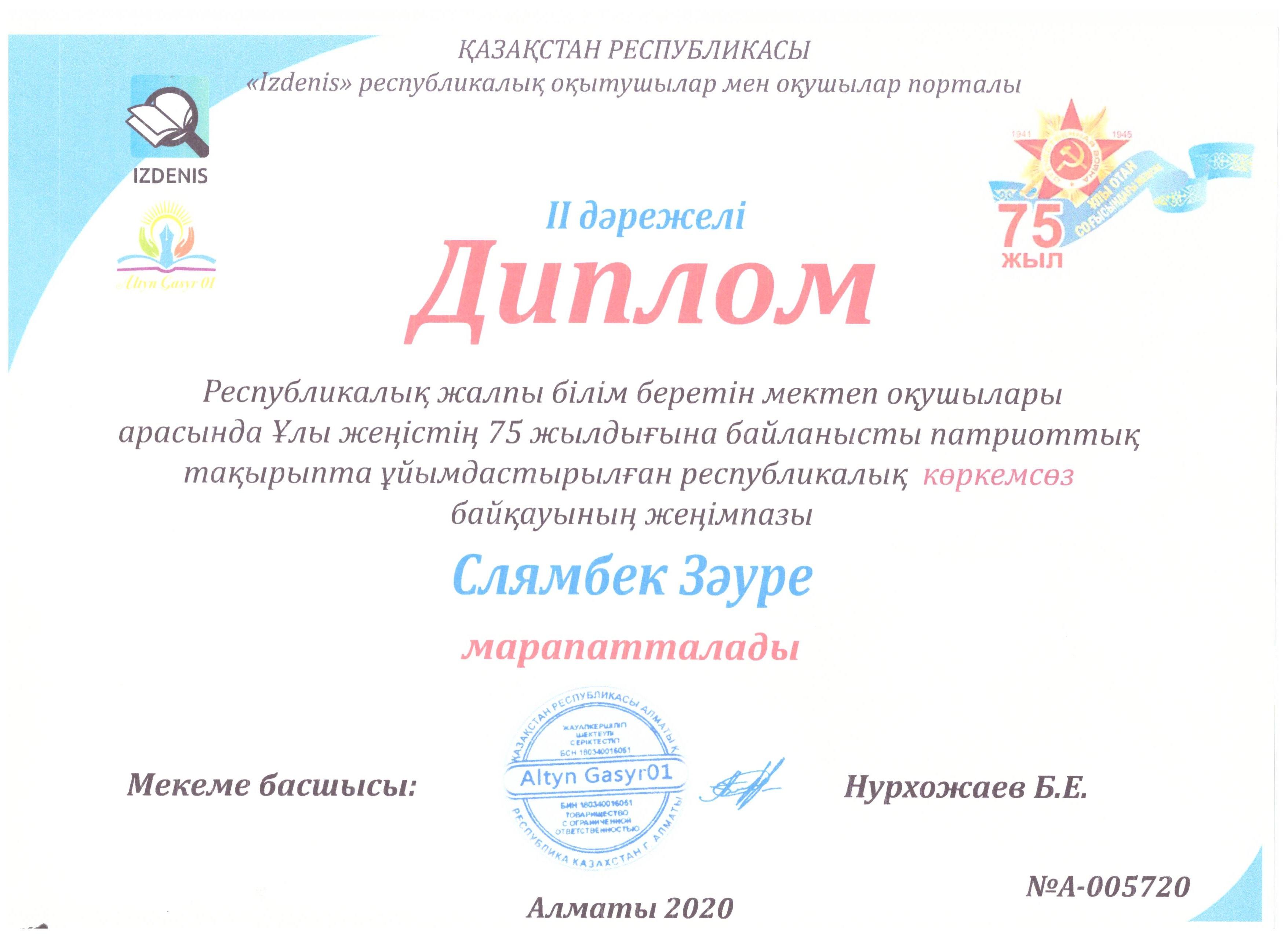 11 май 2020 0 1 2 3 4 5 Ұлы Жеңістің 75 жылдығына арналған патриоттық тақырыпта ұйымдастырылған Республикалық көркем сөз байқауының жеңімпаздары